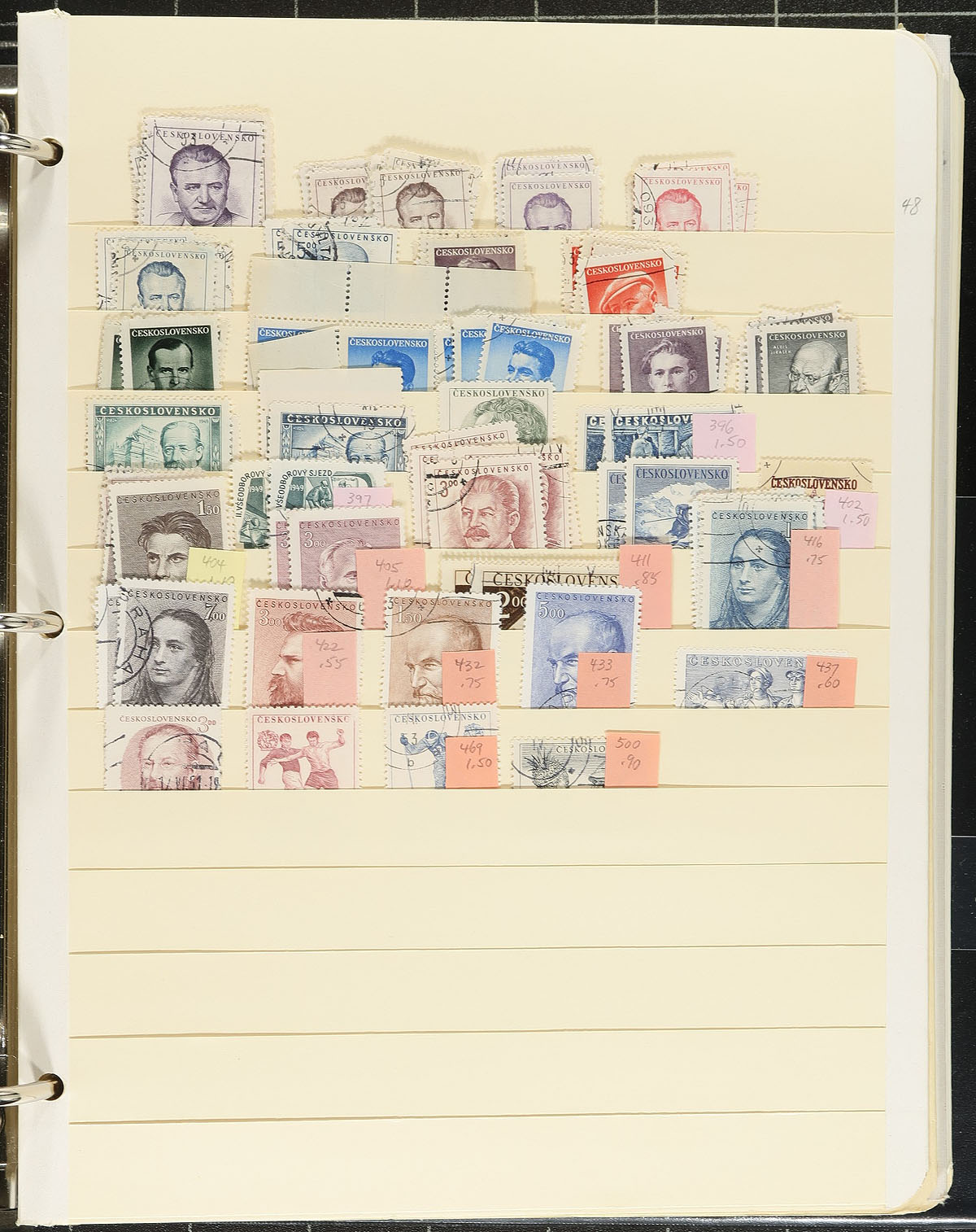An extensive three binder stock with a wide range of Czech issues. Volume 1 is a used stock (more like a collection in places), chronologically mounted in 39 manila stockpages from the early issues up to the early 2000's, plus a good offering from the "back of the book". Volume 2 is a binder with 42 manila stockpages filled with large blocks (up to folded panes) of mint issues from the 1960's to early 1990's (obviously there is heavy duplication here). The final binder is a stock of mostly used Bohemia and Moravia (again with lots of "back of the book"), from the occupation and war era on manila stockpages. There isn’t much material here with significant individual value, but there is extensive coverage, light to moderate duplication, good condition, well organized and perfect for building on (plus there are over 100 manila stockpages!). Estimate alue =