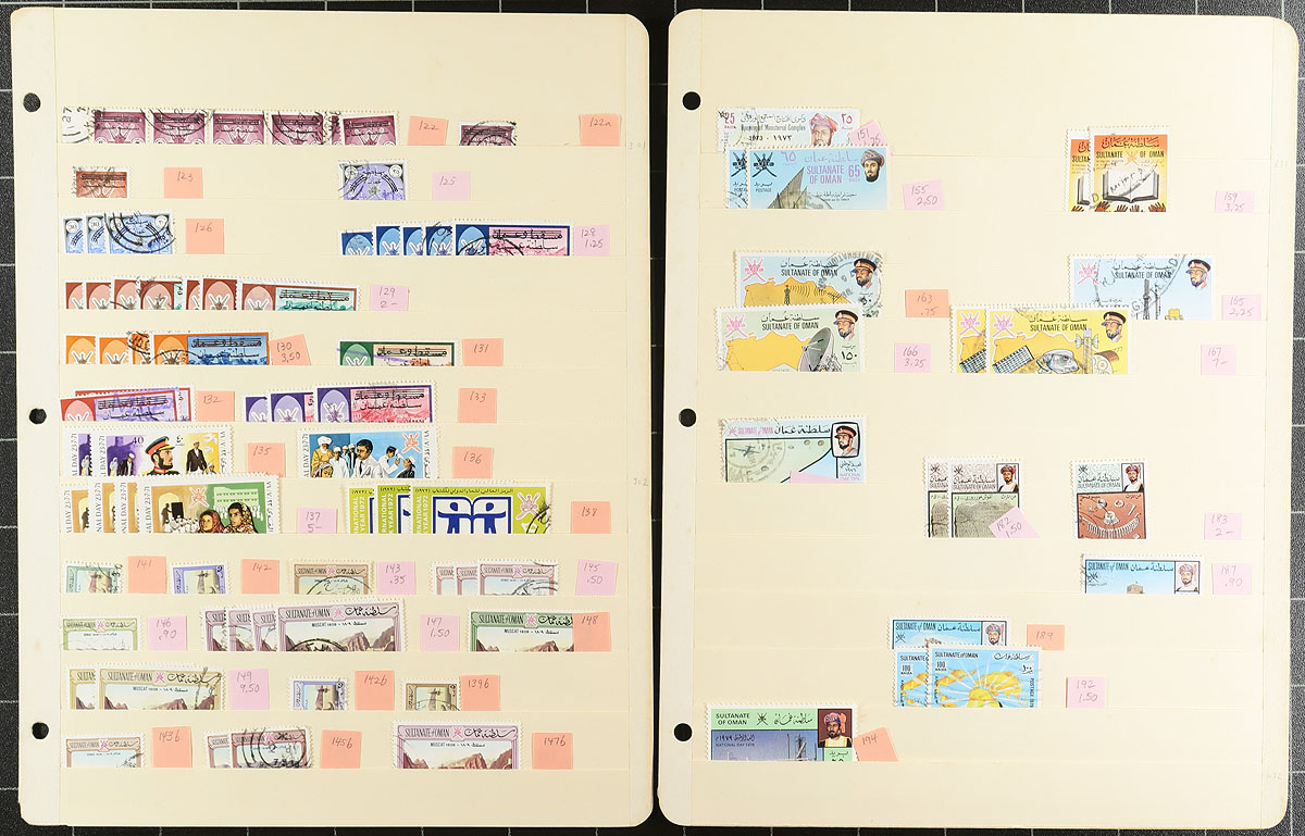 A very uncommon mint and used wholesale lot covering much of the breadth of this Arabian country, including overprinted issues on India and Great Britain stamps, plus "Muscat and Oman" and "Sultanate of Oman". Neatly organized on 15 manila stockpages, identified by Scott number and fairly current catalogue values. Noted #37, #41 (each mint and used), #92 & #93 (mint), #104 (used), #196 (multiple mint copies), #393 (2 mint blocks of six) and the official mint set with overprints on King George VI issues of India. Light duplication of up to 10 of a type, great condition. Estimate =