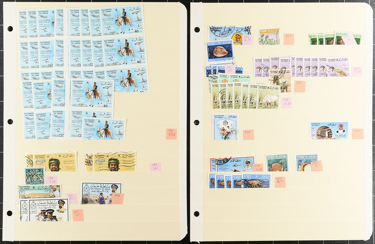 A very uncommon mint and used wholesale lot covering much of the breadth of this Arabian country, including overprinted issues on India and Great Britain stamps, plus "Muscat and Oman" and "Sultanate of Oman". Neatly organized on 15 manila stockpages, identified by Scott number and fairly current catalogue values. Noted #37, #41 (each mint and used), #92 & #93 (mint), #104 (used), #196 (multiple mint copies), #393 (2 mint blocks of six) and the official mint set with overprints on King George VI issues of India. Light duplication of up to 10 of a type, great condition. Estimate =