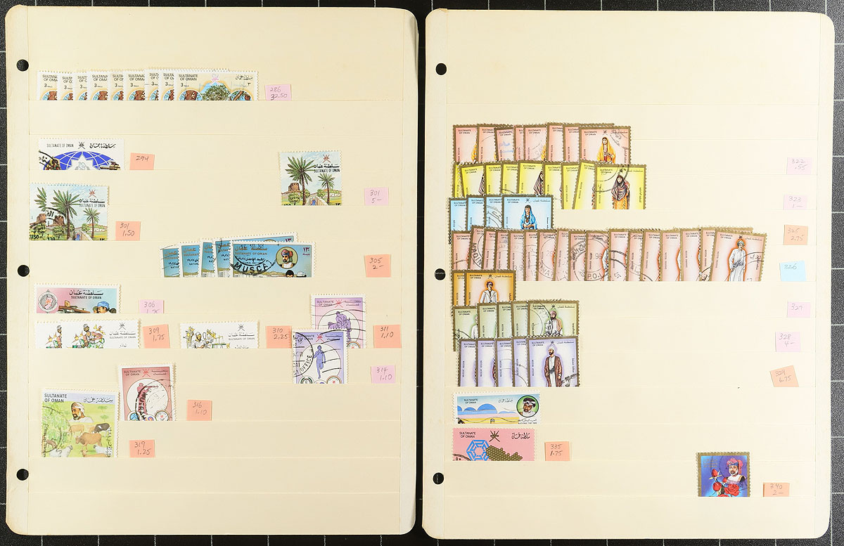 A very uncommon mint and used wholesale lot covering much of the breadth of this Arabian country, including overprinted issues on India and Great Britain stamps, plus "Muscat and Oman" and "Sultanate of Oman". Neatly organized on 15 manila stockpages, identified by Scott number and fairly current catalogue values. Noted #37, #41 (each mint and used), #92 & #93 (mint), #104 (used), #196 (multiple mint copies), #393 (2 mint blocks of six) and the official mint set with overprints on King George VI issues of India. Light duplication of up to 10 of a type, great condition. Estimate =