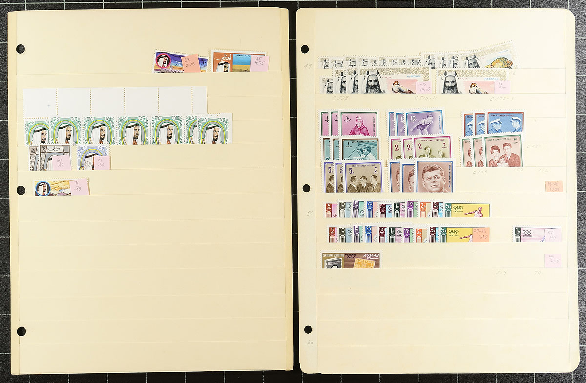 Several Middle Eastern country accumulations, well organized on 18 manila stockpages. Strongest is Ajman (with its usual range of topical friendly issues), Dubai (#65-66, #C1-C8 all mint), Fujeira (#1-18), Qatar (#108G used, #890 (7x used), #891 (3x used)) and touches from Abu Dhabi, Sharjah and South Arabia. Excellent condition and not often seen. A mix of mint and used (with some cancelled-to-order), in quantities up to 10 of a type, many identified by their Scott catalogue numbers and (older) catalogue values. Estimate =