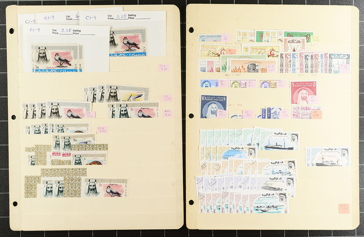 Several Middle Eastern country accumulations, well organized on 18 manila stockpages. Strongest is Ajman (with its usual range of topical friendly issues), Dubai (#65-66, #C1-C8 all mint), Fujeira (#1-18), Qatar (#108G used, #890 (7x used), #891 (3x used)) and touches from Abu Dhabi, Sharjah and South Arabia. Excellent condition and not often seen. A mix of mint and used (with some cancelled-to-order), in quantities up to 10 of a type, many identified by their Scott catalogue numbers and (older) catalogue values. Estimate =