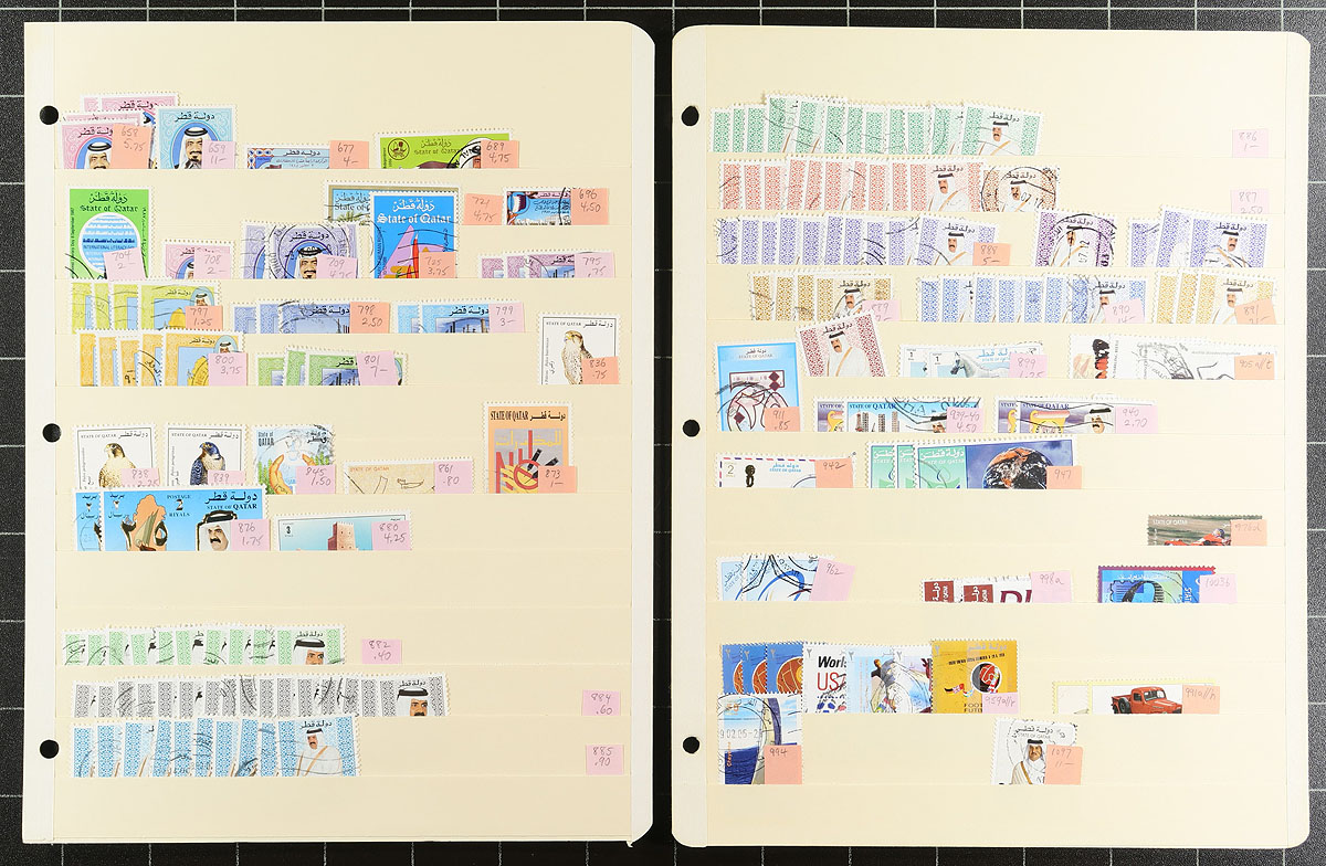 Several Middle Eastern country accumulations, well organized on 18 manila stockpages. Strongest is Ajman (with its usual range of topical friendly issues), Dubai (#65-66, #C1-C8 all mint), Fujeira (#1-18), Qatar (#108G used, #890 (7x used), #891 (3x used)) and touches from Abu Dhabi, Sharjah and South Arabia. Excellent condition and not often seen. A mix of mint and used (with some cancelled-to-order), in quantities up to 10 of a type, many identified by their Scott catalogue numbers and (older) catalogue values. Estimate =