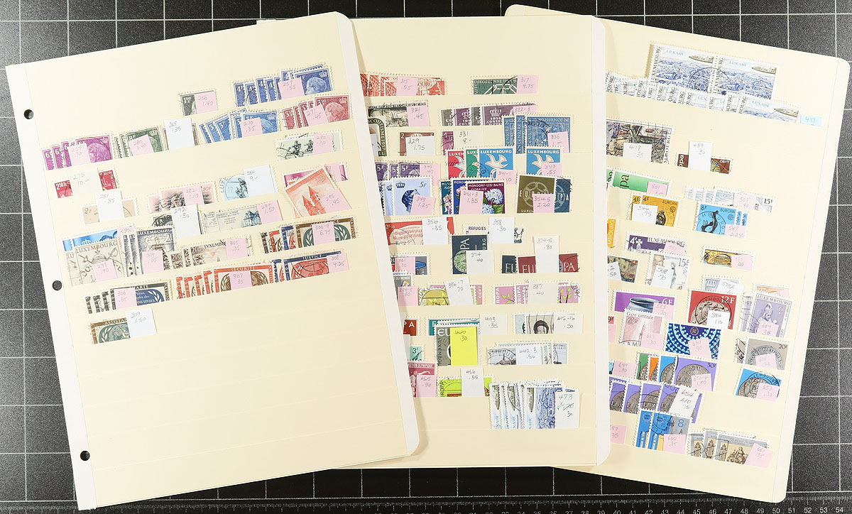 A broad accumulation of used Luxembourg, with issues up to 2005, nicely arranged on 23 manila stockpages in a padded blue "Uni-Safe" three-ring binder. Thorough throughout, including an extensive "back of the book". Lots of cancel potential, the condition is better than normally seen. Much is identified and priced by (older) Scott, but the majority of the heavy work has been done for you. Individual items with catalogue values up to $10.00 each. Not often seen material, especially in the modern era. Estimate =
