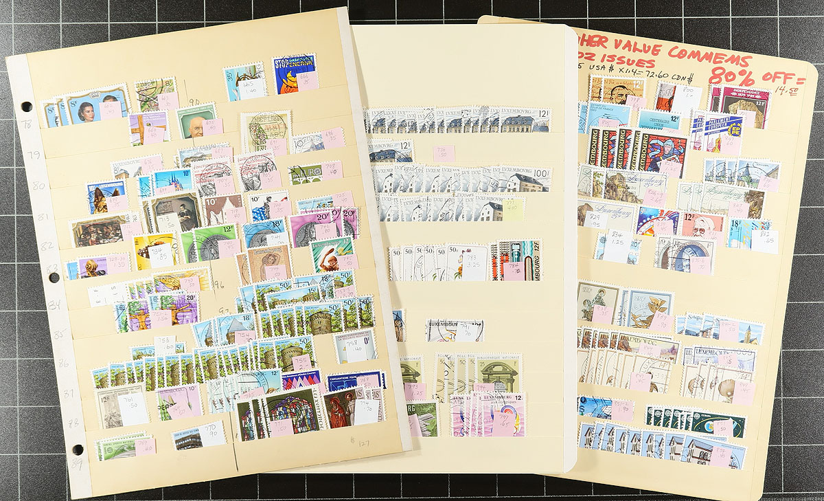 A broad accumulation of used Luxembourg, with issues up to 2005, nicely arranged on 23 manila stockpages in a padded blue "Uni-Safe" three-ring binder. Thorough throughout, including an extensive "back of the book". Lots of cancel potential, the condition is better than normally seen. Much is identified and priced by (older) Scott, but the majority of the heavy work has been done for you. Individual items with catalogue values up to $10.00 each. Not often seen material, especially in the modern era. Estimate =