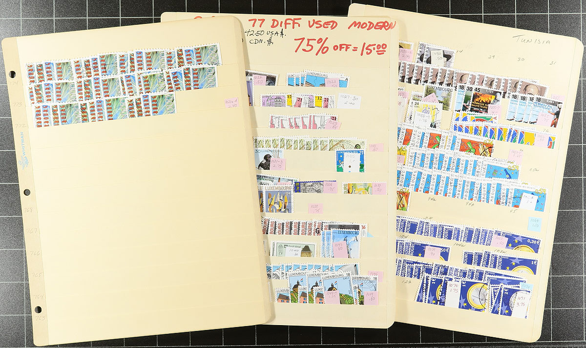 A broad accumulation of used Luxembourg, with issues up to 2005, nicely arranged on 23 manila stockpages in a padded blue "Uni-Safe" three-ring binder. Thorough throughout, including an extensive "back of the book". Lots of cancel potential, the condition is better than normally seen. Much is identified and priced by (older) Scott, but the majority of the heavy work has been done for you. Individual items with catalogue values up to $10.00 each. Not often seen material, especially in the modern era. Estimate =