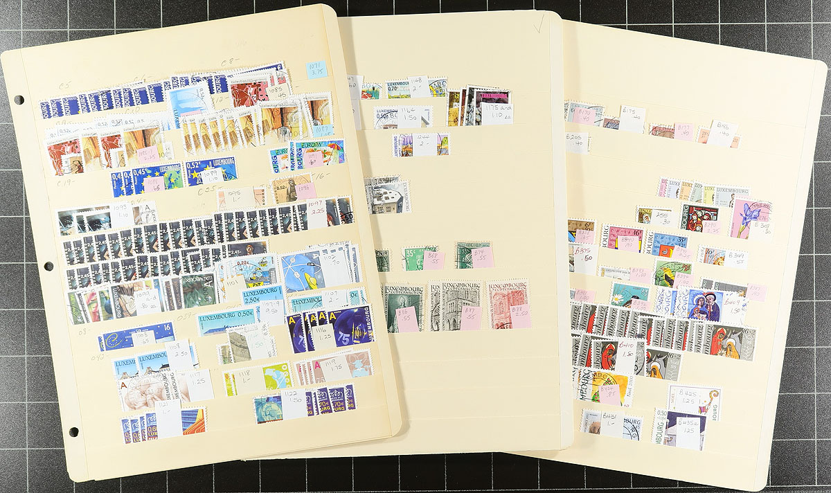 A broad accumulation of used Luxembourg, with issues up to 2005, nicely arranged on 23 manila stockpages in a padded blue "Uni-Safe" three-ring binder. Thorough throughout, including an extensive "back of the book". Lots of cancel potential, the condition is better than normally seen. Much is identified and priced by (older) Scott, but the majority of the heavy work has been done for you. Individual items with catalogue values up to $10.00 each. Not often seen material, especially in the modern era. Estimate =