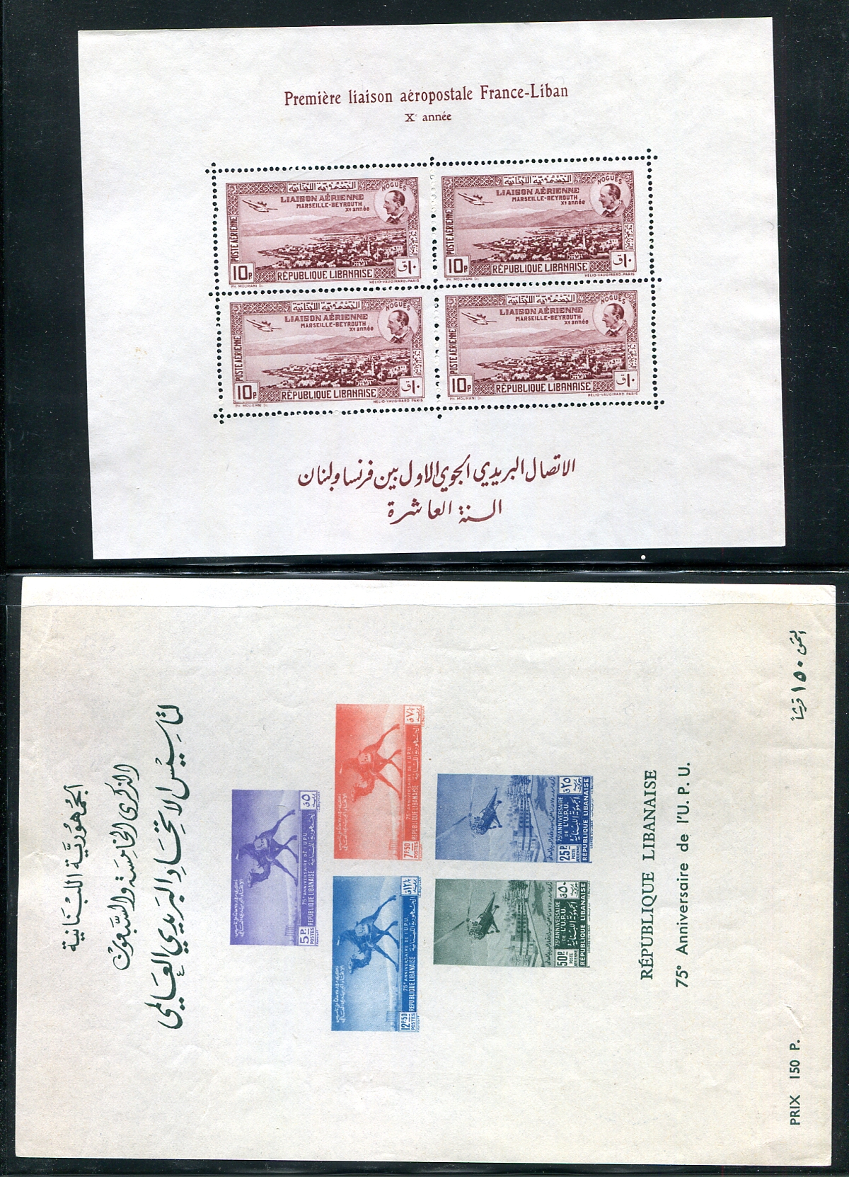Ten airmail miniature sheets or souvenir cards that were often produced as separate offerings and not available to casual collectors. Printed on stamp paper or thin card, these complement regular issues, often depicting the same stamps and sought after by thematic collectors (e.g. 1949 UPU). There are a couple of minor faults, not unusual for such oversized items, but overall condition is better than normal. A great way to add some eye appeal to your collection. 2024 Scott US$312.50 =