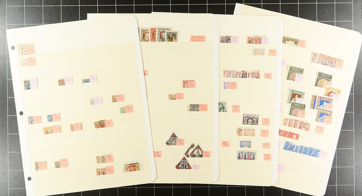 Three phases of Lithuanian philatelic history in a collector’s mint and used stock, on 21 manila stockpages. Starts with five pages of Memel with overprints on German and French stamps, including a good offering of air mails. Very little duplication here, and some nice cancels amongst the used. The next section is the independent issues up to the start of WWII, with ten pages (including some semi-postals and airmail) with some multiples and quantities of up to 20 issues. The balance is the post-USSR independence, with a bit of mint, and scattered issues up to about 2010 (and light duplication). A fascinating Baltic offering. Well organized and excellent condition. Estimate =