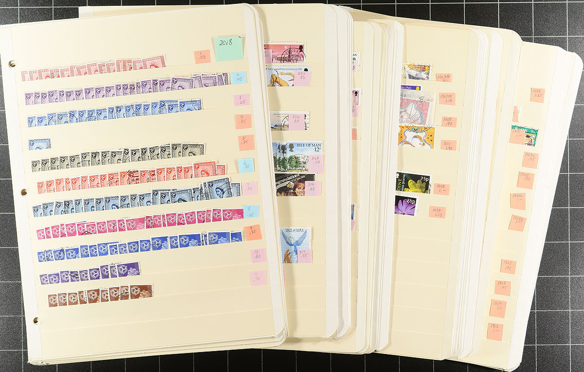 What differentiates this collector’s 32 manila stockpage duplicates from most holdings of IOM is (1) they all appear to be postally used and (2) coverage is strong into the early 21st century. There is substantial coverage throughout, including the many rates found in each of their issues. This is not the kind of material that can be single sourced. To top it off, the collector has meticulously organized everything and added tags with Scott numbers and (2018) catalogue values. Up to 20 of a type, thousands of stamps in total and substantial catalogue value. Don’t wait for the next one. Estimate =