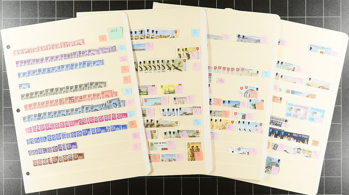 What differentiates this collector’s 32 manila stockpage duplicates from most holdings of IOM is (1) they all appear to be postally used and (2) coverage is strong into the early 21st century. There is substantial coverage throughout, including the many rates found in each of their issues. This is not the kind of material that can be single sourced. To top it off, the collector has meticulously organized everything and added tags with Scott numbers and (2018) catalogue values. Up to 20 of a type, thousands of stamps in total and substantial catalogue value. Don’t wait for the next one. Estimate =