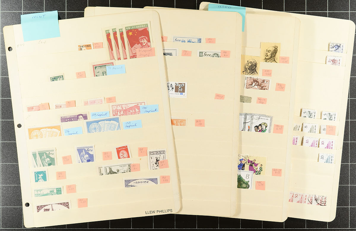 PRC and ROC, separated by country and then mint separated from used (the strength of this holding), this two-country collector’s stock covers much of the 20th century. The PRC includes 2 manila stockpages of mint and 11 of used. The mint Taiwan (ROC) is spread over 5 pages and the used over 11. No specific areas of strength, but there are $5-$10 stamps throughout. There is some potential to find nice cancels. Duplication is mild to moderate and condition is generally good. A total 29 stockpages. Estimate =