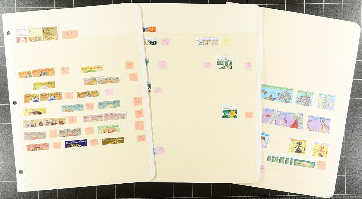 Two Australia-aligned British colonies in this 28-stockpage accumulation. Starts with Christmas Island #1/563 on 18 pages, more used in the earlier issues than normally seen and the post-1990 issues are strongly used (after this Indian Ocean colony’s mail service merged into Australia Post, the issues became usable in either area). Cocos (Keeling) Island #1/343 is on 10 pages with an even mix of mint and used. You never see much used modern material from these island outposts. Issues are post-war up to the early 21st century. Estimate =