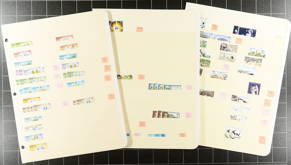 Two Australia-aligned British colonies in this 28-stockpage accumulation. Starts with Christmas Island #1/563 on 18 pages, more used in the earlier issues than normally seen and the post-1990 issues are strongly used (after this Indian Ocean colony’s mail service merged into Australia Post, the issues became usable in either area). Cocos (Keeling) Island #1/343 is on 10 pages with an even mix of mint and used. You never see much used modern material from these island outposts. Issues are post-war up to the early 21st century. Estimate =