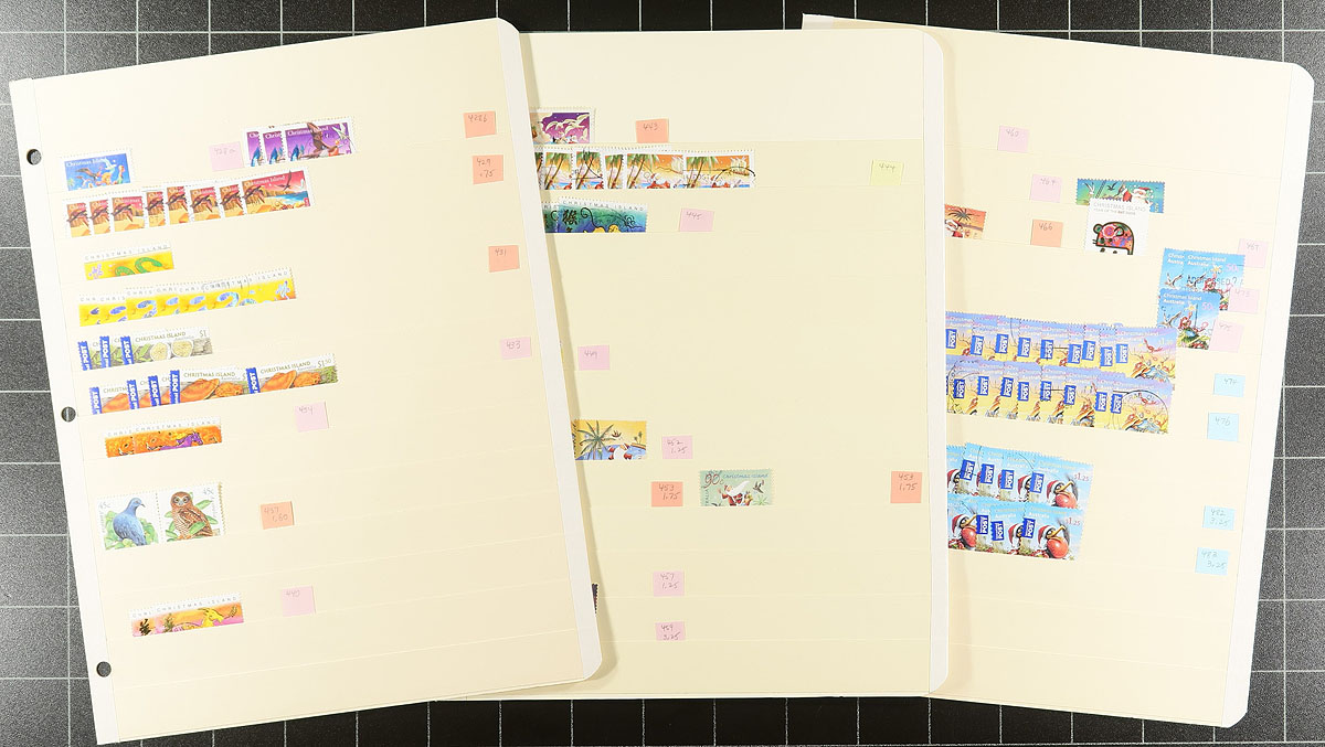 Two Australia-aligned British colonies in this 28-stockpage accumulation. Starts with Christmas Island #1/563 on 18 pages, more used in the earlier issues than normally seen and the post-1990 issues are strongly used (after this Indian Ocean colony’s mail service merged into Australia Post, the issues became usable in either area). Cocos (Keeling) Island #1/343 is on 10 pages with an even mix of mint and used. You never see much used modern material from these island outposts. Issues are post-war up to the early 21st century. Estimate =
