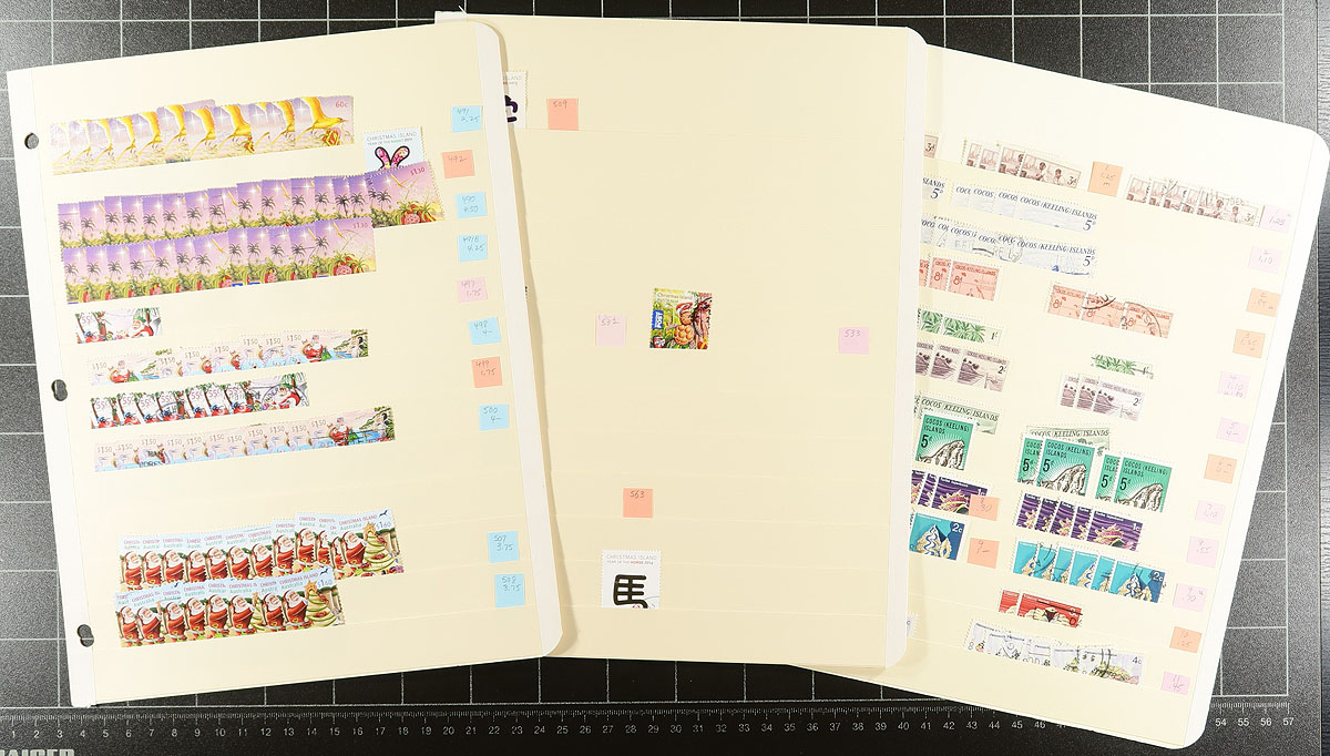 Two Australia-aligned British colonies in this 28-stockpage accumulation. Starts with Christmas Island #1/563 on 18 pages, more used in the earlier issues than normally seen and the post-1990 issues are strongly used (after this Indian Ocean colony’s mail service merged into Australia Post, the issues became usable in either area). Cocos (Keeling) Island #1/343 is on 10 pages with an even mix of mint and used. You never see much used modern material from these island outposts. Issues are post-war up to the early 21st century. Estimate =