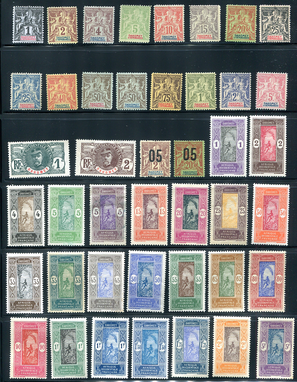 A nice one-page mint primer from the first four sets of this French African colony, now "Benin". Includes most of the "Navigation and Commerce" issue (includes both colours of the 50c and missing only #10) with a couple from the 1906 colonial issue and the 1912 overprints. The lot finishes with a hit or miss selection from the attractive "Oil Palm climber" set to 5 francs. All hinged or with gum disturbance. Use a cautious eye on some of the earlier material, but overall a very useful group. Estimate =