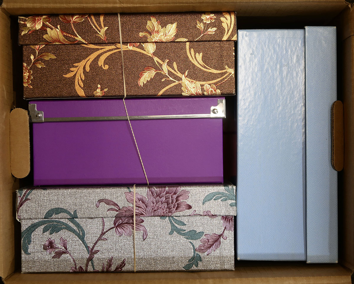 Useful used in a U-Haul box. Two distinct sections. The first is two red dealer’s boxes stuffed with almost two thousand "102" cards with a range of used Canada singles from Queen Victoria to the 21st century. About ½ of one box is used multiples from pairs up to blocks of 8. The cards have light pencil notations which could be easily erased. The second part is a used assortment, sorted by Scott number into #8 envelopes (KGVI onwards), in quantities of 1-20 of a type, all packed into four attractive "photo" boxes. The last box may have a touch of mint material. Besides the thousands and thousands of stamps, there is good "supplies" value here. Estimate =