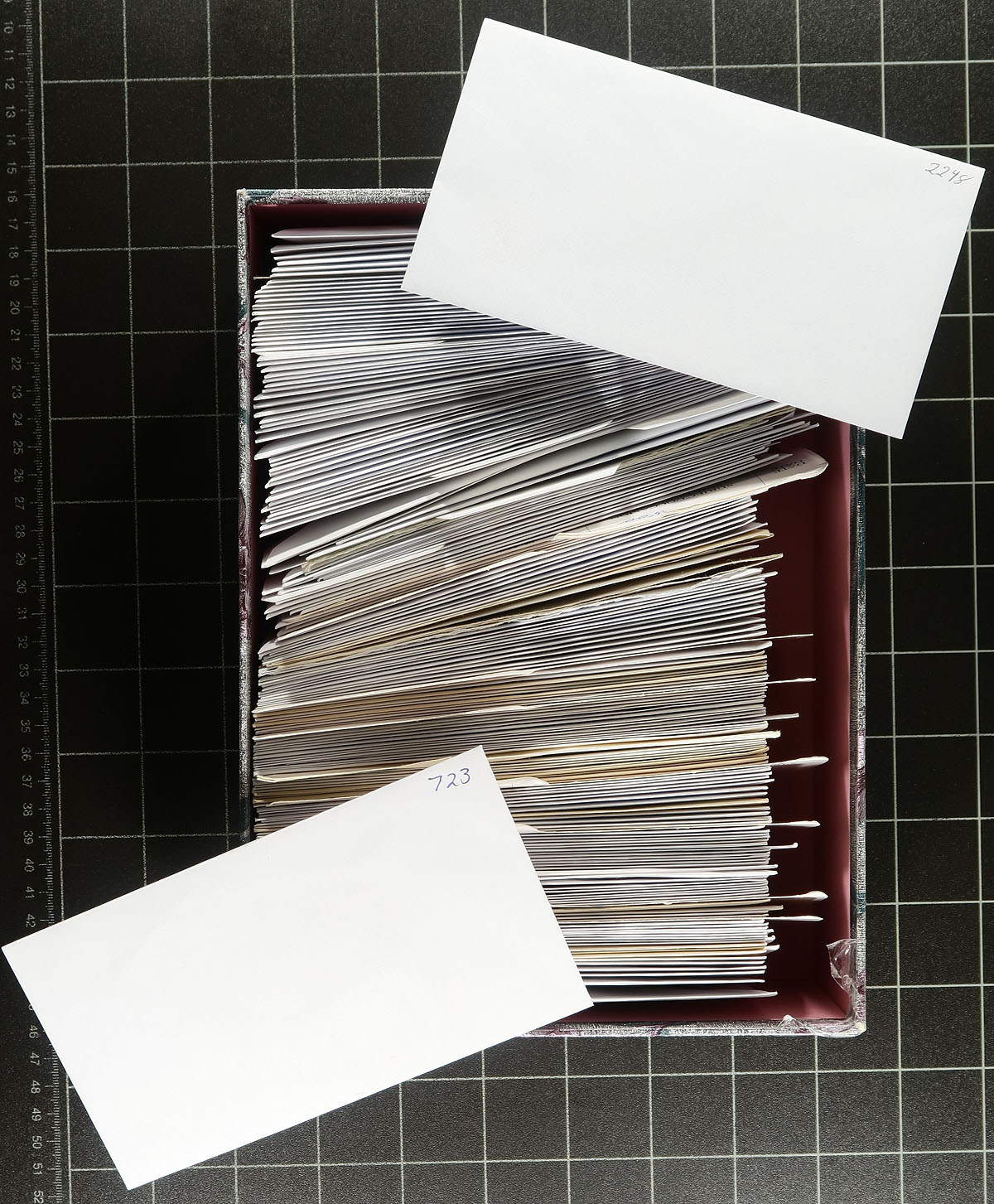 Useful used in a U-Haul box. Two distinct sections. The first is two red dealer’s boxes stuffed with almost two thousand "102" cards with a range of used Canada singles from Queen Victoria to the 21st century. About ½ of one box is used multiples from pairs up to blocks of 8. The cards have light pencil notations which could be easily erased. The second part is a used assortment, sorted by Scott number into #8 envelopes (KGVI onwards), in quantities of 1-20 of a type, all packed into four attractive "photo" boxes. The last box may have a touch of mint material. Besides the thousands and thousands of stamps, there is good "supplies" value here. Estimate =