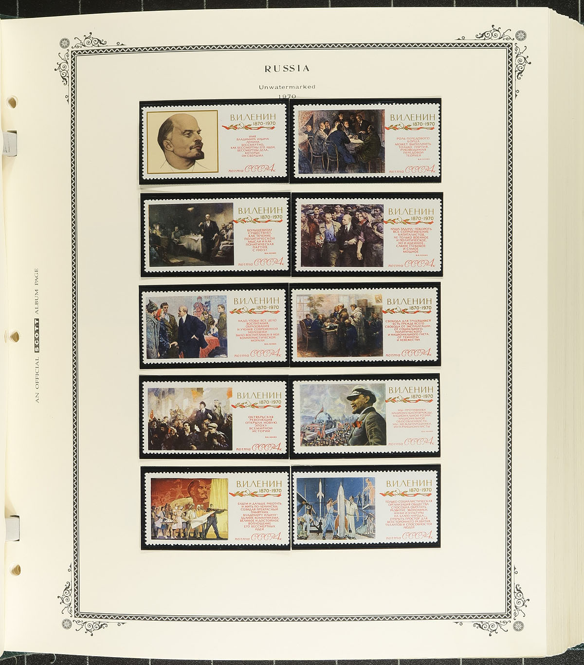 Substantial FIVE-volume collection covering 1858 to 1999 filling a banker’s box. Over 5000 mostly different (some are both mint and used), with lots of sets and souvenir sheets. As you would expect, the earlier tends to be more used, and the more recent is heavily skewed towards mint. Includes better singles such as mint #62-67. Up to 1969 and after 1992 are housed in black "Vario" stockpages, in three ring binders (the pages have substantial value). The 1969-1991 (and the back of the book) are in black and clear mounts on Scott Specialized pages in a pair of green two-post binders (quite worn but doing the job). Very complete coverage and there are significant swaths where the mint is never hinged. Includes an extensive collector inventory, and although it was catalogued 20 years ago, the values are spot on for current values. A tremendous opportunity to engulf yourself Russian stamps with this collection. Owner’s Scott US$5506.60 =