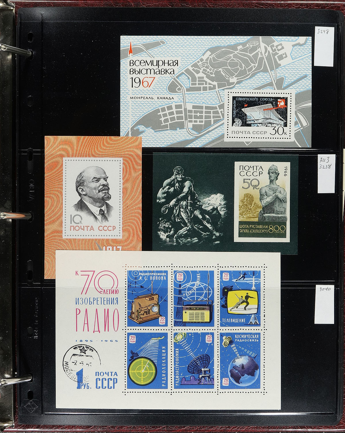 Substantial FIVE-volume collection covering 1858 to 1999 filling a banker’s box. Over 5000 mostly different (some are both mint and used), with lots of sets and souvenir sheets. As you would expect, the earlier tends to be more used, and the more recent is heavily skewed towards mint. Includes better singles such as mint #62-67. Up to 1969 and after 1992 are housed in black "Vario" stockpages, in three ring binders (the pages have substantial value). The 1969-1991 (and the back of the book) are in black and clear mounts on Scott Specialized pages in a pair of green two-post binders (quite worn but doing the job). Very complete coverage and there are significant swaths where the mint is never hinged. Includes an extensive collector inventory, and although it was catalogued 20 years ago, the values are spot on for current values. A tremendous opportunity to engulf yourself Russian stamps with this collection. Owner’s Scott US$5506.60 =