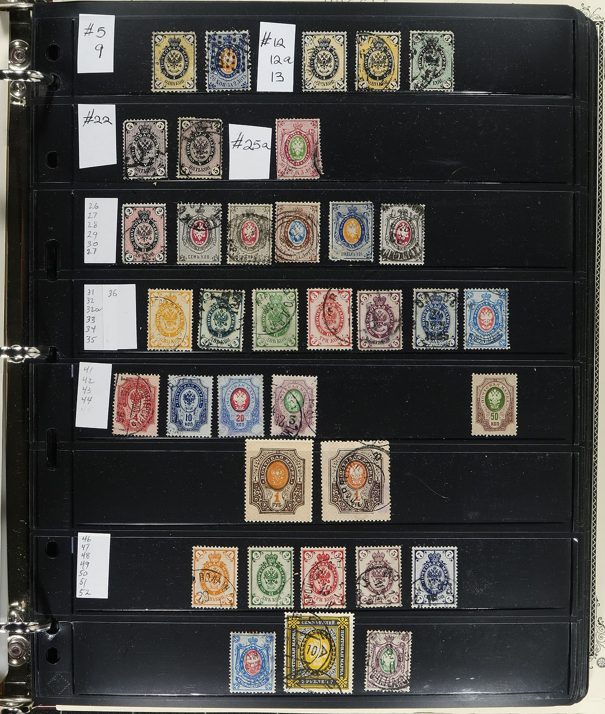Substantial FIVE-volume collection covering 1858 to 1999 filling a banker’s box. Over 5000 mostly different (some are both mint and used), with lots of sets and souvenir sheets. As you would expect, the earlier tends to be more used, and the more recent is heavily skewed towards mint. Includes better singles such as mint #62-67. Up to 1969 and after 1992 are housed in black "Vario" stockpages, in three ring binders (the pages have substantial value). The 1969-1991 (and the back of the book) are in black and clear mounts on Scott Specialized pages in a pair of green two-post binders (quite worn but doing the job). Very complete coverage and there are significant swaths where the mint is never hinged. Includes an extensive collector inventory, and although it was catalogued 20 years ago, the values are spot on for current values. A tremendous opportunity to engulf yourself Russian stamps with this collection. Owner’s Scott US$5506.60 =