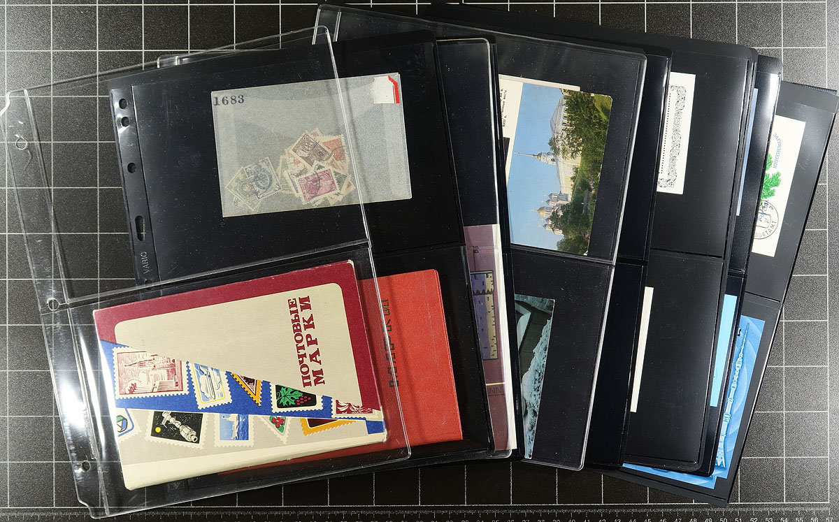 A bankers box with the balance of an extensive Russian accumulation that we have been selling on behalf of a local collector. The biggest section is a large 3-ring binder with an extensive collection of post-war Soviet Union issues on over 70 various stockpages (e.g. Vario, manilla), with souvenir sheets). A folder of First Day Covers is signed by cosmonaut "Leonov". There is a loose mix of off paper, sheetlets, souvenir sheets, some material as bought from dealers (saw some distinctive "Bileski" items), plus more. Strength is post-war, but there is lots to play with here and the stockpages (alone) retail close to the estimated for the lot. Estimate =