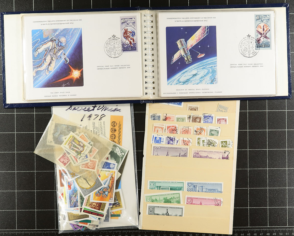 A bankers box with the balance of an extensive Russian accumulation that we have been selling on behalf of a local collector. The biggest section is a large 3-ring binder with an extensive collection of post-war Soviet Union issues on over 70 various stockpages (e.g. Vario, manilla), with souvenir sheets). A folder of First Day Covers is signed by cosmonaut "Leonov". There is a loose mix of off paper, sheetlets, souvenir sheets, some material as bought from dealers (saw some distinctive "Bileski" items), plus more. Strength is post-war, but there is lots to play with here and the stockpages (alone) retail close to the estimated for the lot. Estimate =