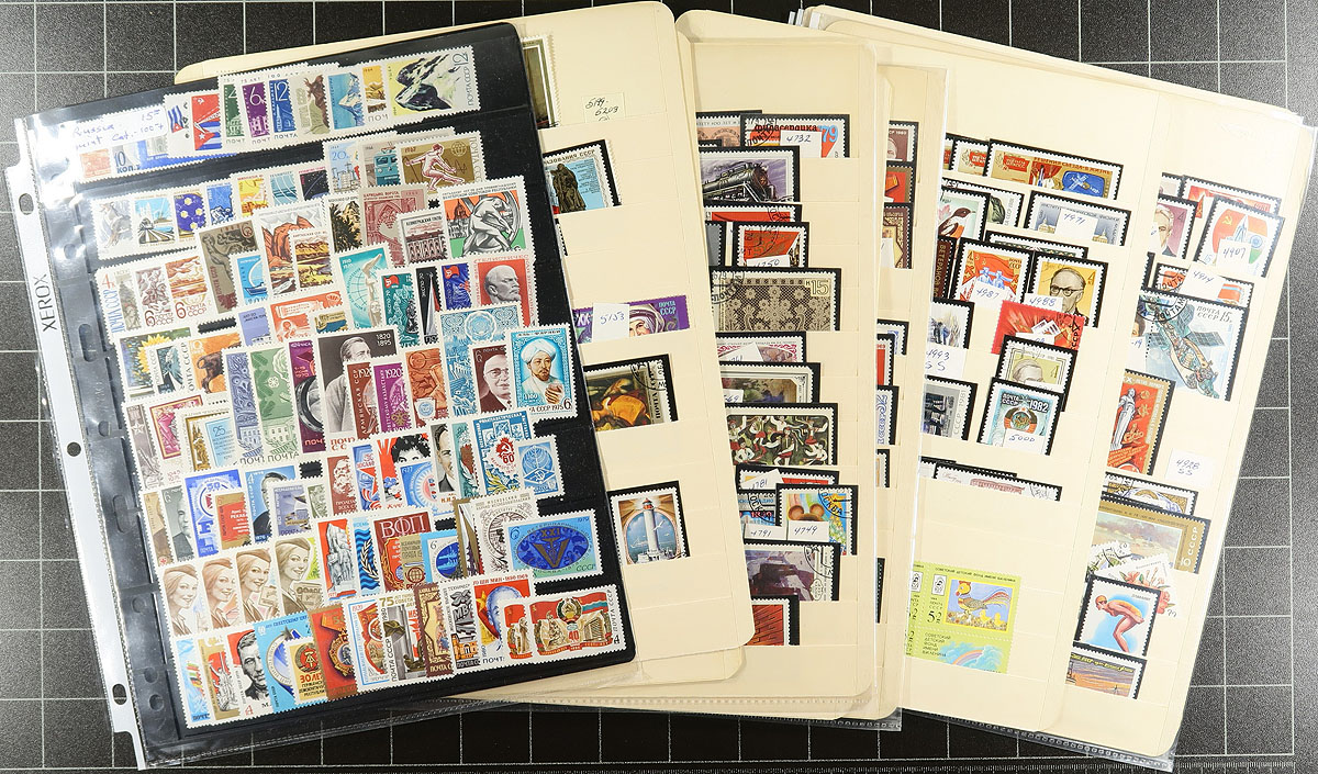 A bankers box with the balance of an extensive Russian accumulation that we have been selling on behalf of a local collector. The biggest section is a large 3-ring binder with an extensive collection of post-war Soviet Union issues on over 70 various stockpages (e.g. Vario, manilla), with souvenir sheets). A folder of First Day Covers is signed by cosmonaut "Leonov". There is a loose mix of off paper, sheetlets, souvenir sheets, some material as bought from dealers (saw some distinctive "Bileski" items), plus more. Strength is post-war, but there is lots to play with here and the stockpages (alone) retail close to the estimated for the lot. Estimate =