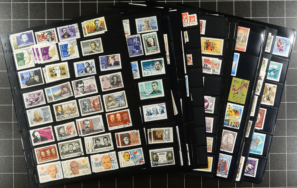 A bankers box with the balance of an extensive Russian accumulation that we have been selling on behalf of a local collector. The biggest section is a large 3-ring binder with an extensive collection of post-war Soviet Union issues on over 70 various stockpages (e.g. Vario, manilla), with souvenir sheets). A folder of First Day Covers is signed by cosmonaut "Leonov". There is a loose mix of off paper, sheetlets, souvenir sheets, some material as bought from dealers (saw some distinctive "Bileski" items), plus more. Strength is post-war, but there is lots to play with here and the stockpages (alone) retail close to the estimated for the lot. Estimate =