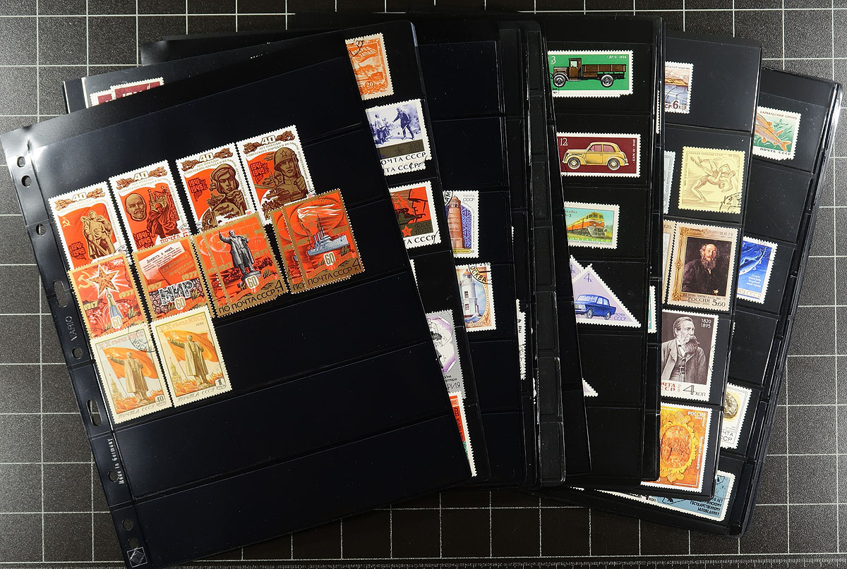 A bankers box with the balance of an extensive Russian accumulation that we have been selling on behalf of a local collector. The biggest section is a large 3-ring binder with an extensive collection of post-war Soviet Union issues on over 70 various stockpages (e.g. Vario, manilla), with souvenir sheets). A folder of First Day Covers is signed by cosmonaut "Leonov". There is a loose mix of off paper, sheetlets, souvenir sheets, some material as bought from dealers (saw some distinctive "Bileski" items), plus more. Strength is post-war, but there is lots to play with here and the stockpages (alone) retail close to the estimated for the lot. Estimate =
