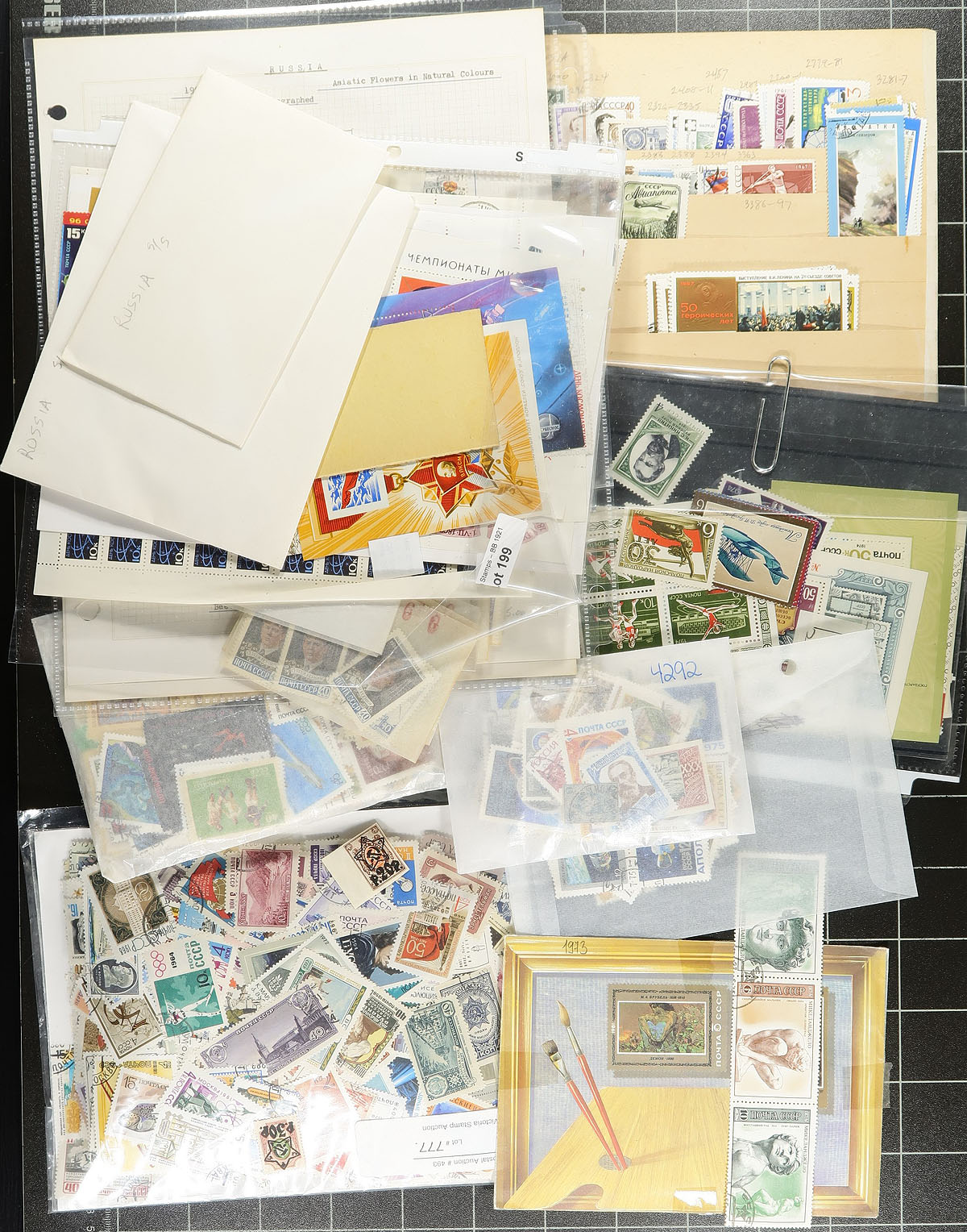 A bankers box with the balance of an extensive Russian accumulation that we have been selling on behalf of a local collector. The biggest section is a large 3-ring binder with an extensive collection of post-war Soviet Union issues on over 70 various stockpages (e.g. Vario, manilla), with souvenir sheets). A folder of First Day Covers is signed by cosmonaut "Leonov". There is a loose mix of off paper, sheetlets, souvenir sheets, some material as bought from dealers (saw some distinctive "Bileski" items), plus more. Strength is post-war, but there is lots to play with here and the stockpages (alone) retail close to the estimated for the lot. Estimate =