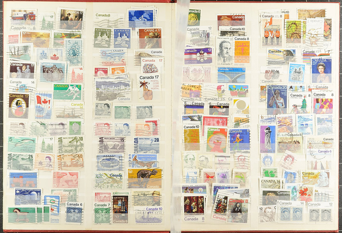 A pair of banker’s boxes filled with philatelic fun, the balance of a consignment. While there is a wide range of material here, at first glance, the strength appears to be Canada and Great Britain. There are three older Harris albums with a worldwide collection with thousands of stamps. There is a 16-page stockbook and a couple other binders. We noted 150 Canada private cachet first day covers from the 1960's-1970's (lots of "Schering" in various sizes and some "Elliot-Marion" plus more). An old accordion file has an assortment of modern worldwide, with pockets of mint Canada & GB. There are a couple of nice older tins filled with loose stamps, and one box is heavily filled with worldwide kiloware (most on paper). This is the perfect lot for the collector who wants to hunker down with a project over the winder or for a club that wants a few meetings with lots of material to pile through. Estimated value =