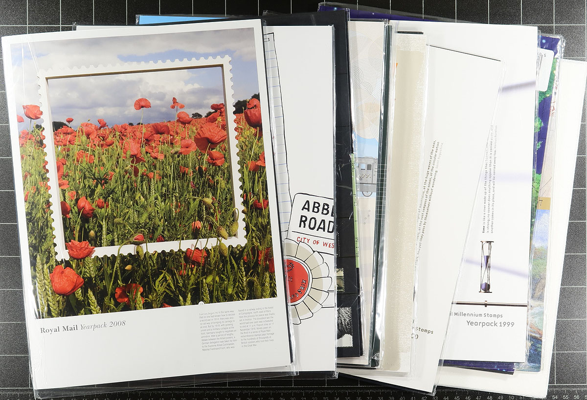 Fourteen consecutive years of Annual Folders (1995-2008), with all of the commemorative issues (and some definitives) for each given year. All are in their original packaging as received from the Post Office. The folders are in good shape and the stamps are on their original pages, complete and in perfect condition. These have better coverage than the hardbound year sets, which originally cost more but have a smaller representation of stamps. Original cost was over £250.00. As annual folders, the 2023 Stanley Gibbons Concise catalogue value is £739.50 =