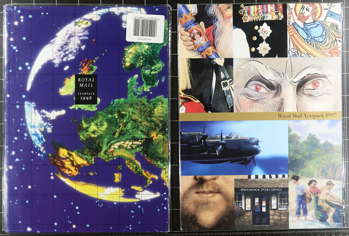 Fourteen consecutive years of Annual Folders (1995-2008), with all of the commemorative issues (and some definitives) for each given year. All are in their original packaging as received from the Post Office. The folders are in good shape and the stamps are on their original pages, complete and in perfect condition. These have better coverage than the hardbound year sets, which originally cost more but have a smaller representation of stamps. Original cost was over £250.00. As annual folders, the 2023 Stanley Gibbons Concise catalogue value is £739.50 =