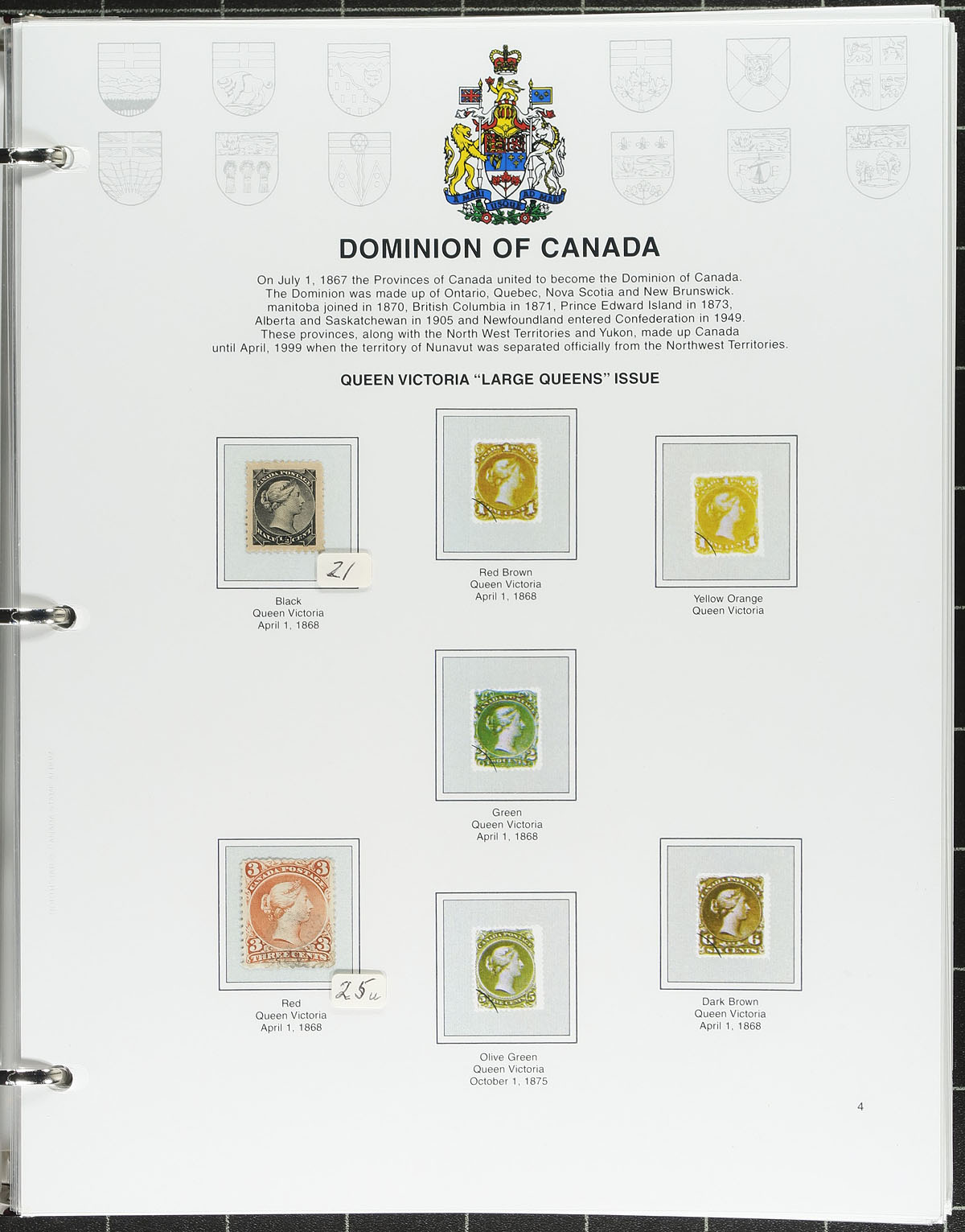 Mostly used collection from the Large Queens up to 2021 on "Northstar" CWS full colour album pages. From the Admiral era onwards the material is either quite complete or quite sparse. On pages which have stamps, the collector has put the page into a clear page protector and put Scott numbers on stickers, leaving the pages as-new. With the addition of the page protectors, the collector mercifully purchased more albums to hold this expanded size and what retails as five volumes is spread over 10 binders and 7 matching slip cases. The collection includes a couple of thousand different stamps, but the value is in the album, with the extra pieces retails at over $1600.00, and is remarkably current. Estimate =