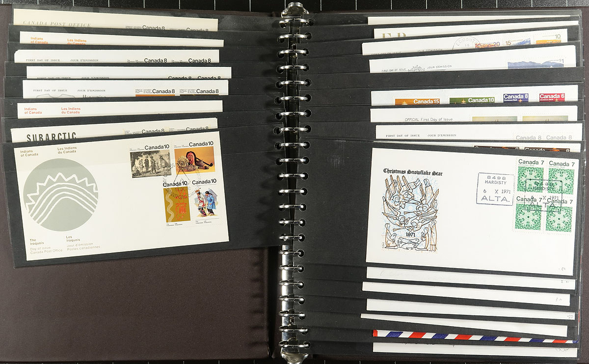 Seven albums of private and Canada Post cacheted First Day Cover accumulation, mostly mid-1960's to 1980's. About 450 covers in total, noting Rosecraft, Fleetwood/Kingswood, Canada Post and then a couple of small scattering of "one offs" (like "NR"), plus a small group of uncacheted covers (most with Hardisty Alberta MOON cancels from the early 1970s). There is a good mix of singles and plate blocks, with a few matched sets and a bit of light duplication. As usual the earlier are addressed and the later, less so. The albums are in good shape, with four being cover albums and three are binders with black stockpages. Estimate =