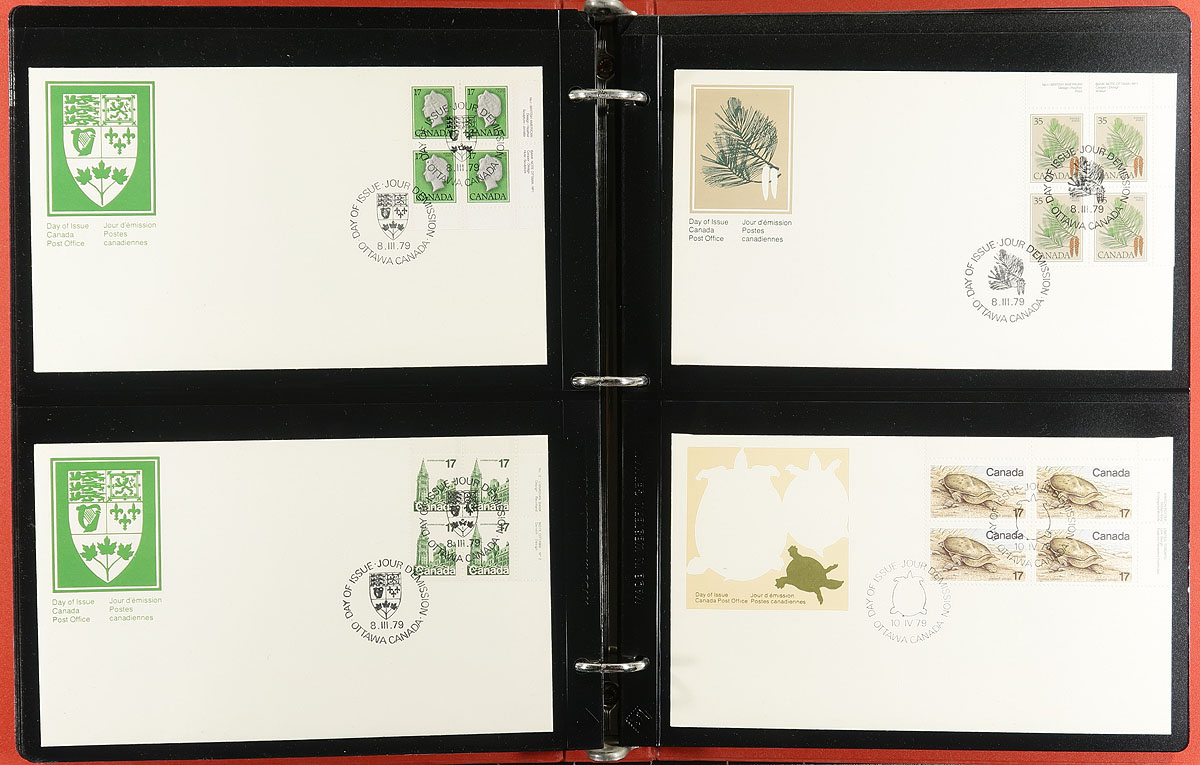 Seven albums of private and Canada Post cacheted First Day Cover accumulation, mostly mid-1960's to 1980's. About 450 covers in total, noting Rosecraft, Fleetwood/Kingswood, Canada Post and then a couple of small scattering of "one offs" (like "NR"), plus a small group of uncacheted covers (most with Hardisty Alberta MOON cancels from the early 1970s). There is a good mix of singles and plate blocks, with a few matched sets and a bit of light duplication. As usual the earlier are addressed and the later, less so. The albums are in good shape, with four being cover albums and three are binders with black stockpages. Estimate =