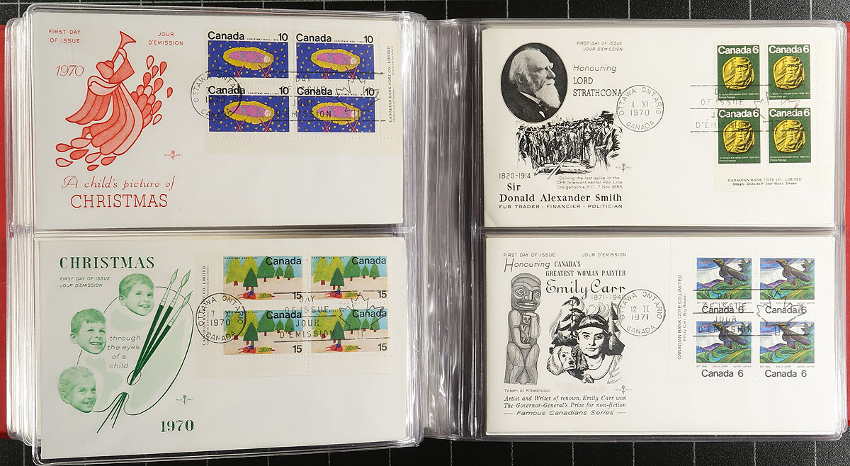 Seven albums of private and Canada Post cacheted First Day Cover accumulation, mostly mid-1960's to 1980's. About 450 covers in total, noting Rosecraft, Fleetwood/Kingswood, Canada Post and then a couple of small scattering of "one offs" (like "NR"), plus a small group of uncacheted covers (most with Hardisty Alberta MOON cancels from the early 1970s). There is a good mix of singles and plate blocks, with a few matched sets and a bit of light duplication. As usual the earlier are addressed and the later, less so. The albums are in good shape, with four being cover albums and three are binders with black stockpages. Estimate =