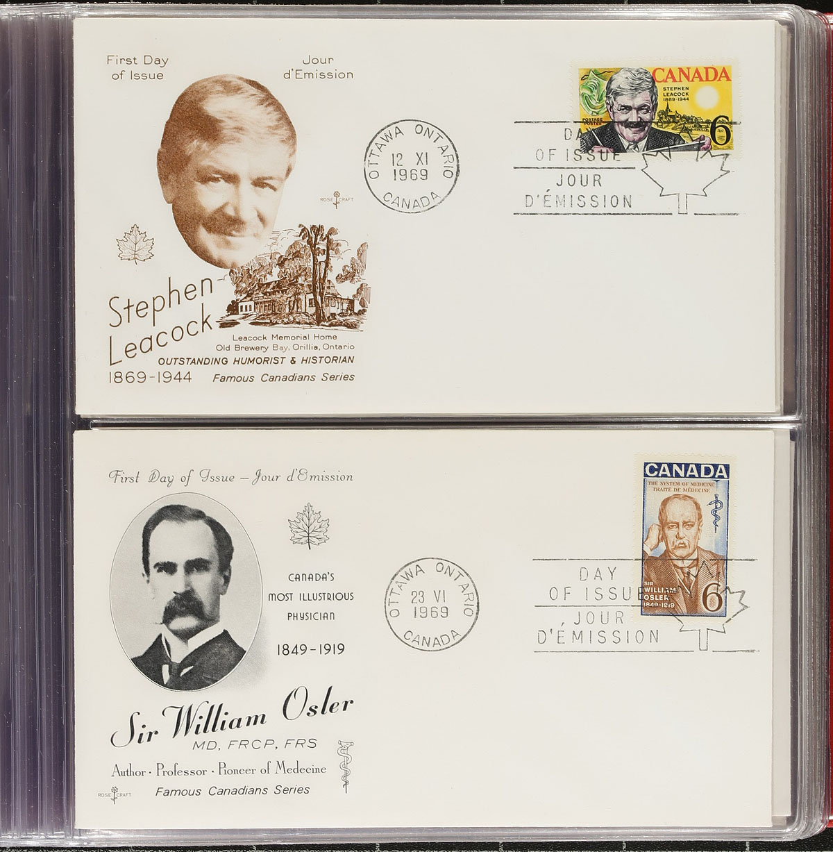 Seven albums of private and Canada Post cacheted First Day Cover accumulation, mostly mid-1960's to 1980's. About 450 covers in total, noting Rosecraft, Fleetwood/Kingswood, Canada Post and then a couple of small scattering of "one offs" (like "NR"), plus a small group of uncacheted covers (most with Hardisty Alberta MOON cancels from the early 1970s). There is a good mix of singles and plate blocks, with a few matched sets and a bit of light duplication. As usual the earlier are addressed and the later, less so. The albums are in good shape, with four being cover albums and three are binders with black stockpages. Estimate =