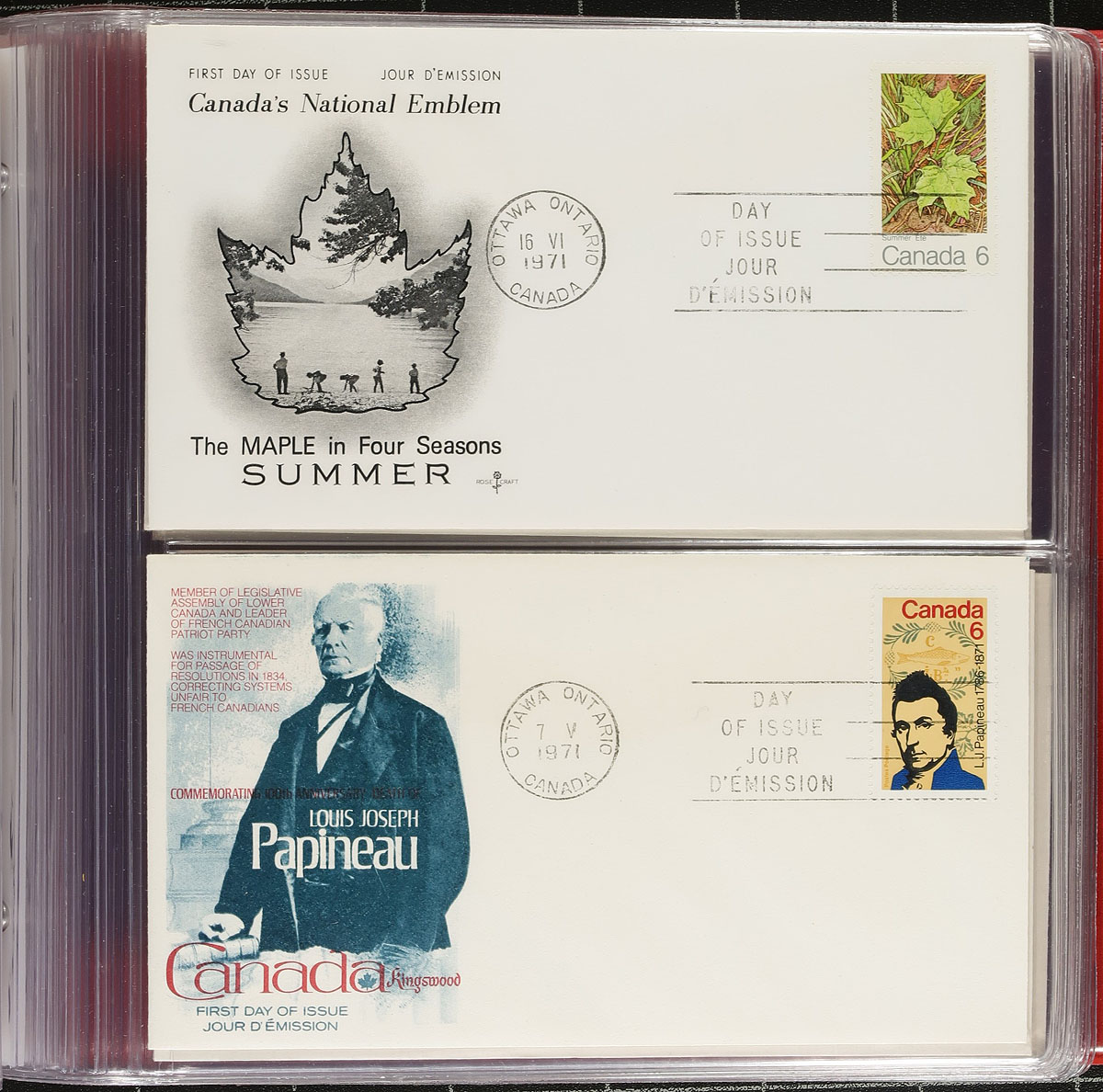 Seven albums of private and Canada Post cacheted First Day Cover accumulation, mostly mid-1960's to 1980's. About 450 covers in total, noting Rosecraft, Fleetwood/Kingswood, Canada Post and then a couple of small scattering of "one offs" (like "NR"), plus a small group of uncacheted covers (most with Hardisty Alberta MOON cancels from the early 1970s). There is a good mix of singles and plate blocks, with a few matched sets and a bit of light duplication. As usual the earlier are addressed and the later, less so. The albums are in good shape, with four being cover albums and three are binders with black stockpages. Estimate =