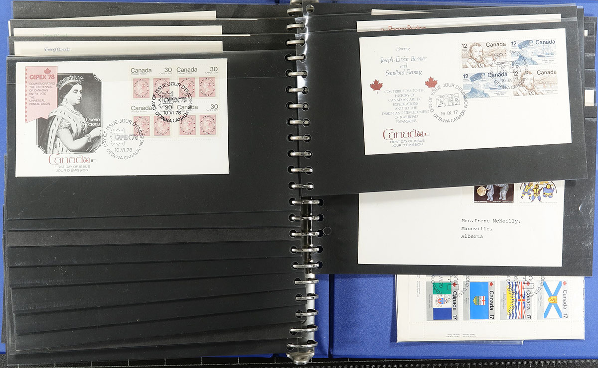 Seven albums of private and Canada Post cacheted First Day Cover accumulation, mostly mid-1960's to 1980's. About 450 covers in total, noting Rosecraft, Fleetwood/Kingswood, Canada Post and then a couple of small scattering of "one offs" (like "NR"), plus a small group of uncacheted covers (most with Hardisty Alberta MOON cancels from the early 1970s). There is a good mix of singles and plate blocks, with a few matched sets and a bit of light duplication. As usual the earlier are addressed and the later, less so. The albums are in good shape, with four being cover albums and three are binders with black stockpages. Estimate =