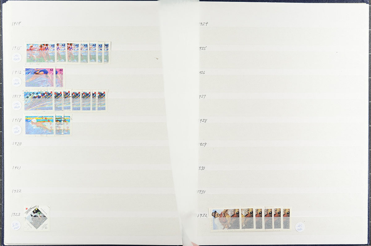 Extensive holding of used Canada from the small queens into the 21st century, neatly organized into 11x 32-page and 2x-16 page stock books, a mix of Lighthouse and Uni-Safe brand (plus one additional, and uncounted stockbook). The coverage is light to the end of the King George V period, but from King George VI onwards, there is often a dozen of a type (no multiples or souvenir sheets). Thousands and thousands of stamps here, all neatly organized. The stockbooks have some labels and pen notations, but are otherwise functional. Quite comfortably fills a banker’s box. Estimate =