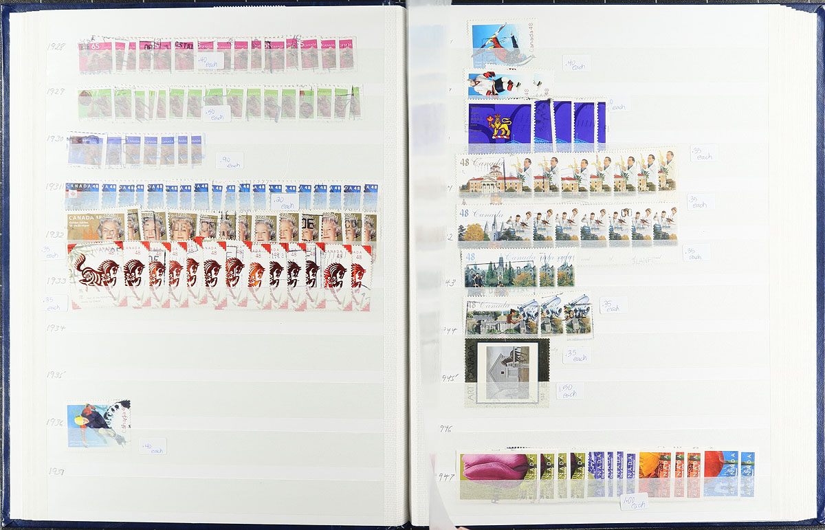Extensive holding of used Canada from the small queens into the 21st century, neatly organized into 11x 32-page and 2x-16 page stock books, a mix of Lighthouse and Uni-Safe brand (plus one additional, and uncounted stockbook). The coverage is light to the end of the King George V period, but from King George VI onwards, there is often a dozen of a type (no multiples or souvenir sheets). Thousands and thousands of stamps here, all neatly organized. The stockbooks have some labels and pen notations, but are otherwise functional. Quite comfortably fills a banker’s box. Estimate =
