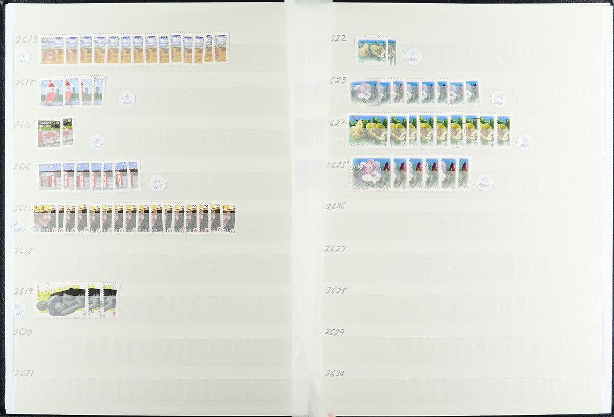 Extensive holding of used Canada from the small queens into the 21st century, neatly organized into 11x 32-page and 2x-16 page stock books, a mix of Lighthouse and Uni-Safe brand (plus one additional, and uncounted stockbook). The coverage is light to the end of the King George V period, but from King George VI onwards, there is often a dozen of a type (no multiples or souvenir sheets). Thousands and thousands of stamps here, all neatly organized. The stockbooks have some labels and pen notations, but are otherwise functional. Quite comfortably fills a banker’s box. Estimate =