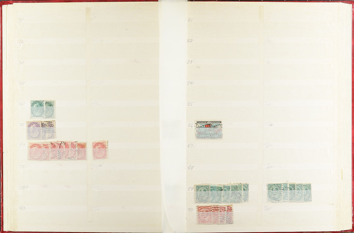 Extensive holding of used Canada from the small queens into the 21st century, neatly organized into 11x 32-page and 2x-16 page stock books, a mix of Lighthouse and Uni-Safe brand (plus one additional, and uncounted stockbook). The coverage is light to the end of the King George V period, but from King George VI onwards, there is often a dozen of a type (no multiples or souvenir sheets). Thousands and thousands of stamps here, all neatly organized. The stockbooks have some labels and pen notations, but are otherwise functional. Quite comfortably fills a banker’s box. Estimate =