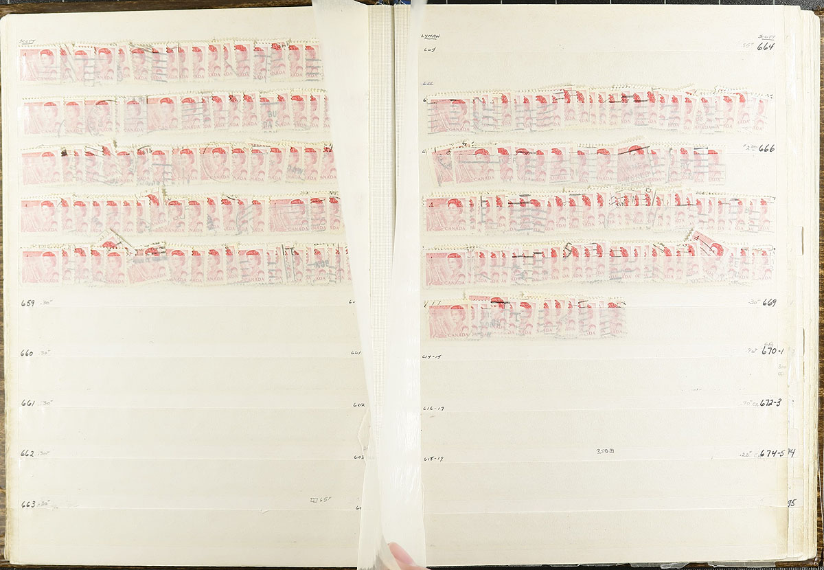 Extensive holding of used Canada from the small queens into the 21st century, neatly organized into 11x 32-page and 2x-16 page stock books, a mix of Lighthouse and Uni-Safe brand (plus one additional, and uncounted stockbook). The coverage is light to the end of the King George V period, but from King George VI onwards, there is often a dozen of a type (no multiples or souvenir sheets). Thousands and thousands of stamps here, all neatly organized. The stockbooks have some labels and pen notations, but are otherwise functional. Quite comfortably fills a banker’s box. Estimate =