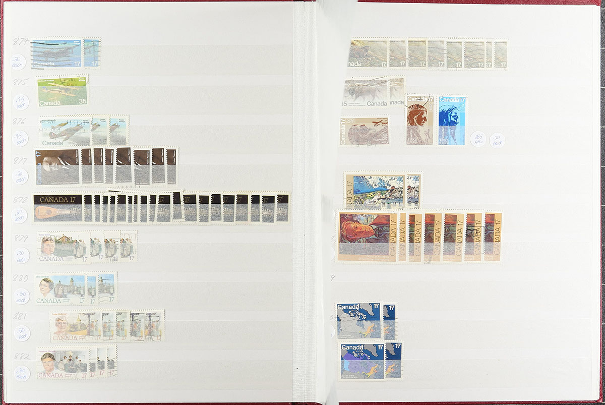 Extensive holding of used Canada from the small queens into the 21st century, neatly organized into 11x 32-page and 2x-16 page stock books, a mix of Lighthouse and Uni-Safe brand (plus one additional, and uncounted stockbook). The coverage is light to the end of the King George V period, but from King George VI onwards, there is often a dozen of a type (no multiples or souvenir sheets). Thousands and thousands of stamps here, all neatly organized. The stockbooks have some labels and pen notations, but are otherwise functional. Quite comfortably fills a banker’s box. Estimate =
