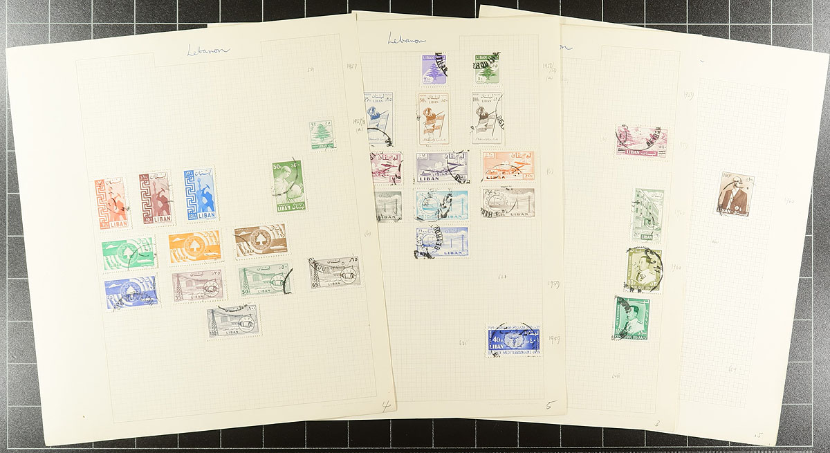 A trio of Middle Eastern countries featured in a nice mounted collection of used stamps from the 1940's to about 1978. Laid out on quadrilled pages in a near-new red Stanley Gibbons "Tower" springback binder (retails for over $50.00). The collection has been meticulously catalogued by the owner. Jordan ($250.00), Kuwait ($160.00) and Lebanon ($380.00). Condition appears to be excellent with no duplication. Total 2025 Scott US$790.00 =