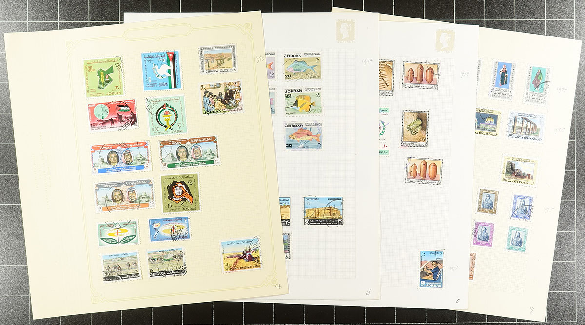 A trio of Middle Eastern countries featured in a nice mounted collection of used stamps from the 1940's to about 1978. Laid out on quadrilled pages in a near-new red Stanley Gibbons "Tower" springback binder (retails for over $50.00). The collection has been meticulously catalogued by the owner. Jordan ($250.00), Kuwait ($160.00) and Lebanon ($380.00). Condition appears to be excellent with no duplication. Total 2025 Scott US$790.00 =